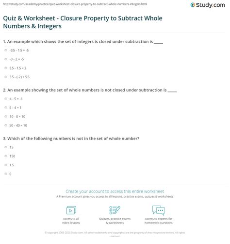 Closure Property Worksheet. 4 x 5 = 20, which is an integer. The sum of any two whole numbers will always be a.