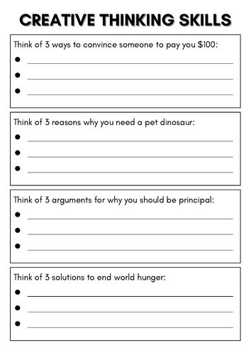 Creative Thinking Worksheet. This is a bundle of 21 fun and challenging worksheets designed to facilitate creative and critical thinking in your students. Students read the predictions to each other and then answer what they think.