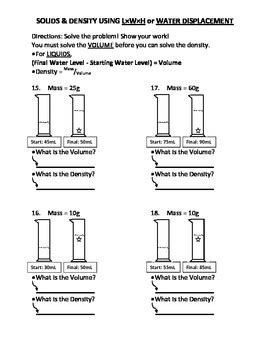 Density problems worksheet with answers. This two page, ten question worksheet gives students practice using the density formula and answering questions about sinking and floating. The formula for calculating density is: